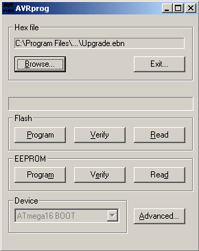On the AVRprog control dialog, click the Browse... button in the Hex file pane. A Browse dialog will appear. Navigate through the file system on your PC to the folder in which you installed AVR Studio (click here for a screen shot). If you have multiple versions installed, be careful to select the right one. From the installation folder, go into the JTAGICE folder. The file you are looking for is called Upgrade.ebn. In order to see it, change the Files of type: pick list to All files (*.*). Double-click the file or select it and click Open (click here for a screen shot). The Browse dialog will close and the file is now selected for programming. Its name will appear in the static control in the Hex file pane, although there isn't usually room for the full path.