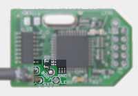To manually load software into the AVR ICE-Cube, you need to activate the built-in Flash Loader and then use AVR Prog in the normal way. The Flash Loader can be activated by applying power to the ICE-Cube while a special "boot" pad is shorted to ground. You will find this boot pad close to where the serial cable terminates on the ICE-Cube. Refer to the picture at right. Move your mouse cursor over it to zoom in on the exposed boot pad. A ground connection almost completely surrounds it and is also exposed.
