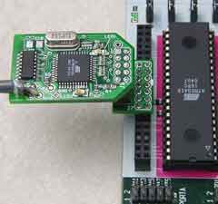 The photograph at left shows the adapter in use on the STK500 with the ECROS Technology AVR ICE-Cube, but it can be used with other JTAG ICE interfaces too, including the Atmel one. Click on the photograph for a larger version.