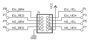 The schematic of the 10-pin header, J1, intended for the interface to the microcontroller is shown at right. Pins 1 to 8 should be connected to general purpose I/O ports. Pin 9 should be the common ground and power must be supplied at pin 10. Note that this pin arrangement is standard on Atmel products such as the STK500 and AVR Butterfly. You can therefore use a 10-way ribbon cable to directly connect an AVR-based microcontroller system to the Traffic Lights Project. Click here for a picture of the Traffic Lights Project connected to the Atmel STK500. Note that pin 1 of header J1 is at bottom-right when you hold the PCB with "North" at the top. It is marked on the silk screen with a small triangle. If you turn the PCB over, you will also see that the pad of pin 1 is square, whereas all the others are round. Be sure to connect the ribbon cable the right way round.