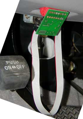 Now, plug the DLC adapter board into the Diagnostic Link Connector of the car. It will only fit one way. As you turn the adapter board to orient the connector, you will put a half-twist in the adapter cable and the marked side will now be on the left. Press the adapter board firmly behind the DLC connector to seat it. The picture at right shows the DLC adapter and cable correctly installed. The pedal in the picture marked "push on/off" is the emergency brake.