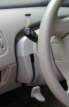 Concealing the Adapter CableFor the standard installation, the first thing to do is to pass the DLC adapter cable behind the steering wheel assembly and down behind the dash. The result is shown in the picture at right. When the upper end is connected to the Mini-Scanner and the lower end to the DLC adapter, the cable is concealed, leading to a tidy appearance. However, this is by far the most tricky part of the installation, so don't attempt this when you're hurried or in a bad mood.