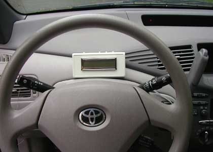 Installation and OperationA practical way to install the Mini-Scanner in the Prius is to put it behind the steering wheel, where most cars have their instruments (see picture at right, Mark I shown). Although you can install the device in other ways or just leave it hanging loose for passengers to play with, I have written up the installation guide assuming this standard method.