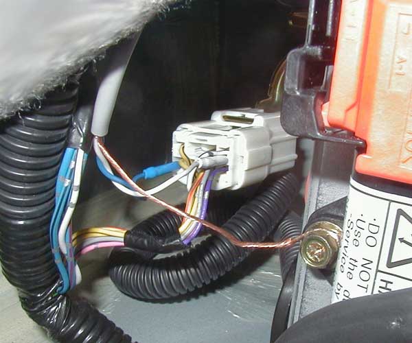 How you make a connection to this wire is up to you. If you don't mind a miniscule modification to the car, I think the best way is to use an insulation displacement splice. This clips over the existing wire and your new wire and punches through the insulation. You don't have to cut the existing wire. Or, you can splice in some other way. I happen to be unreasonably paranoid about modifying the car. I took a heavy duty paper staple, straightened it out and soldered it onto the end of my sensor wire. I put two layers of heat-shrink sleeving over the soldered joint to reinforce it and act as a sort of handle. Then, I poked the staple into the back of the SMR connector so that it slid in between the plastic housing and the metal contacts of the appropriate pin. If you pick the right staple or piece of stiff wire, this forms a decent connection but can be removed without a trace.