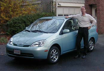Well, decades later it turns out that the series hybrid is not the optimum mass-market solution. The efficiency of a piston engine can be improved using the Atkinson / Miller cycle or lean-burn and various other techniques. Energy loss associated with conversion of mechanical energy to electrical energy, storage in a battery and conversion back to mechanical energy again is best avoided by transfering at least some of the engine's power directly to the wheels using gears. Cars using these principles began to be available in the U.S.A. as the millenium turned over. I am rather to big to fit in the tiny Honda Insight, so the Prius became my choice when I decided to replace my ageing Mazda 626. So, there I am, above/right, posed self-conciously by my Toyota Prius gasoline/electric hybrid car.