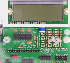 The Dragon Rider printed circuit board includes an area for a 2 Line by 16 Character LCD module and support circuits. A 10-pin header allows the LCD to be linked to a target microcontroller port with a 10-way ribbon cable of the type supplied with the Atmel STK500. The module uses the very common HD44780-type controller, wired in 4-bit mode to conserve port bits. Firm support is provided by standoffs and the display contrast can be adjusted with a trimmer potentiometer.