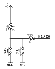 The schematic of the push-button switch circuits is show at right. There are four circuits like this. The vehicle sensor for North-South traffic is shown. As the switches are connected in parallel, with this circuit you cannot separately sense traffic arriving from the North and from the South. There is an identical circuit for the East-West vehicle sensor. The other two circuits are for Pedestrians and Emergency Vehicles and they have only one switch each.